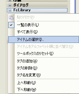 FcLibraryコンポーネントは、 以下の手順にてツールボックスに追加します。(Visual Studio 2005を例に記載しています。Visual Studio 2008以降でも同様の手順です)