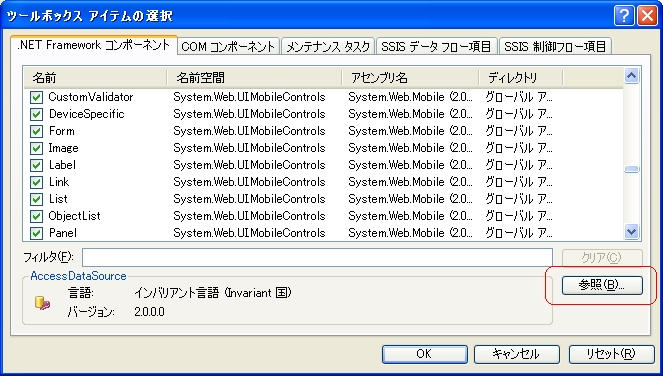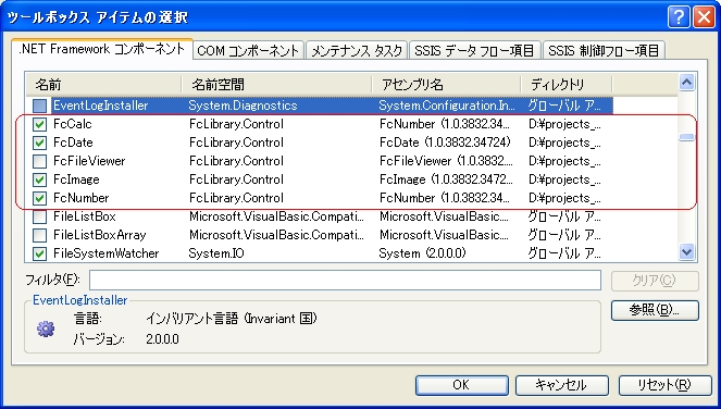 ・"ツールボックス アイテムの選択"ダイアログボックスが表示されます。参照ボタンを押してください。ファイル選択画面が表示されます。FcLibraryをセットアップしたフォルダ (※通常は、C:\Program Files\FcLibrary です) を選択し以下のファイルを選択してください。
